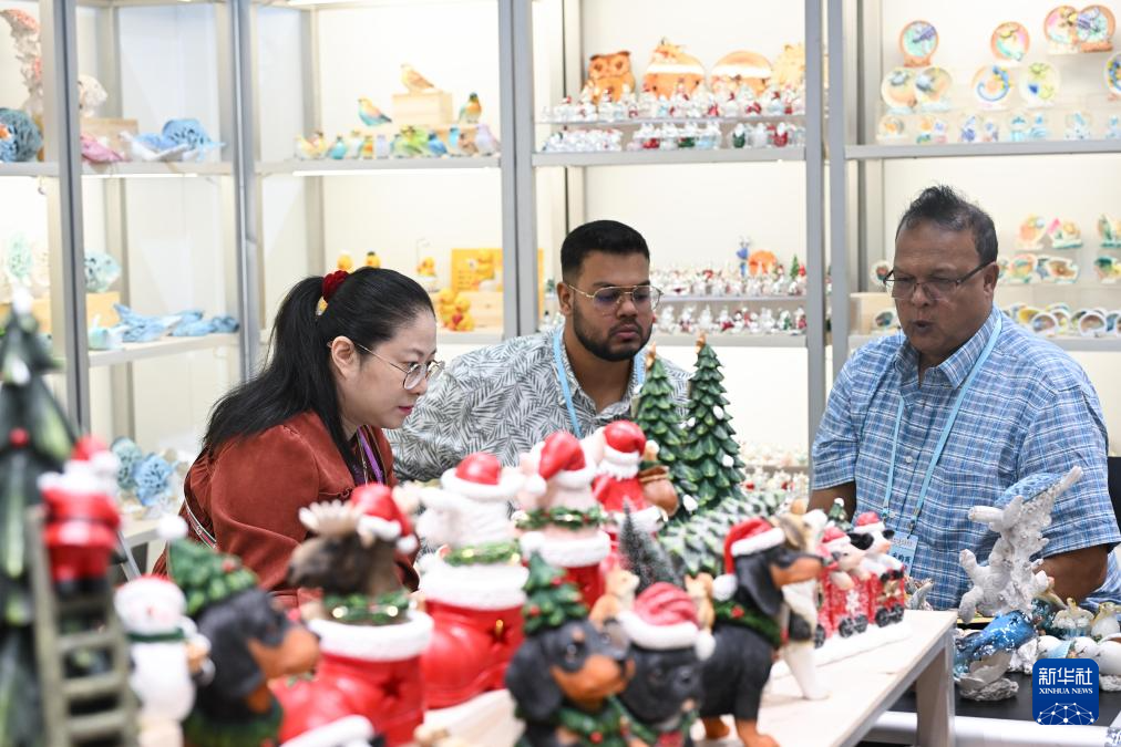 10月23日,境外采购商在礼品装饰品展台洽谈。新华社记者 邓华 摄