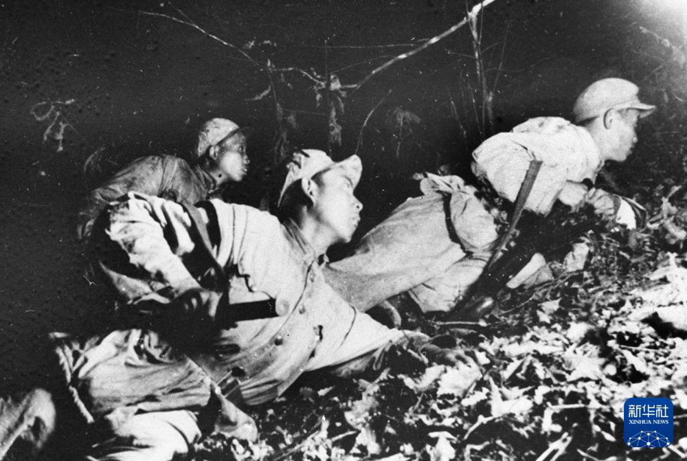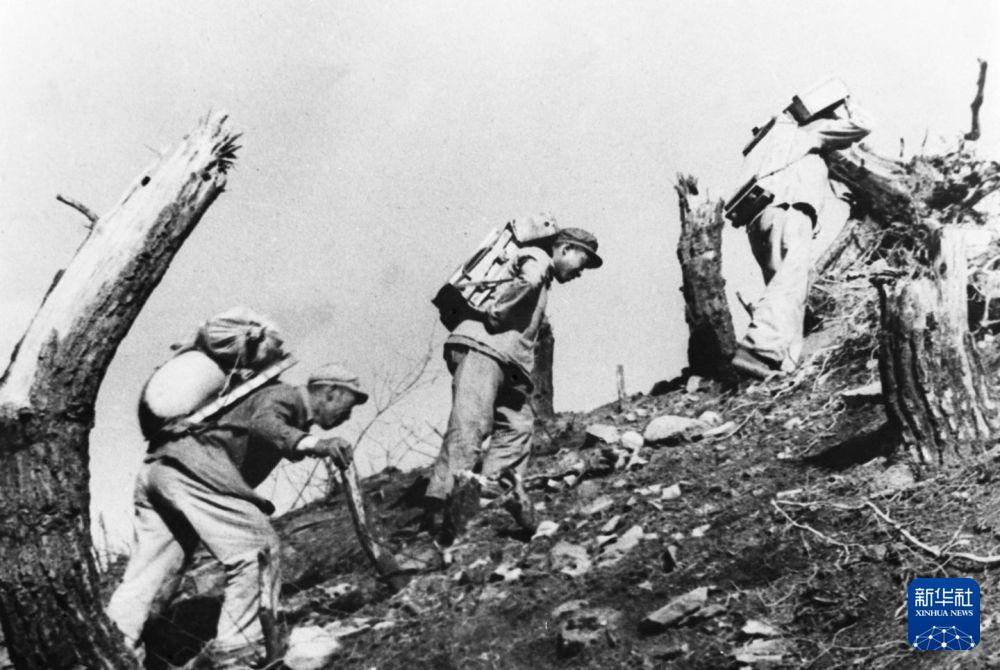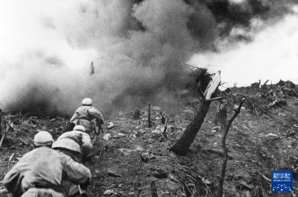 在上甘岭战役中,中国人民志愿军指战员在炮火支援下,攻上537.7高地北山。
