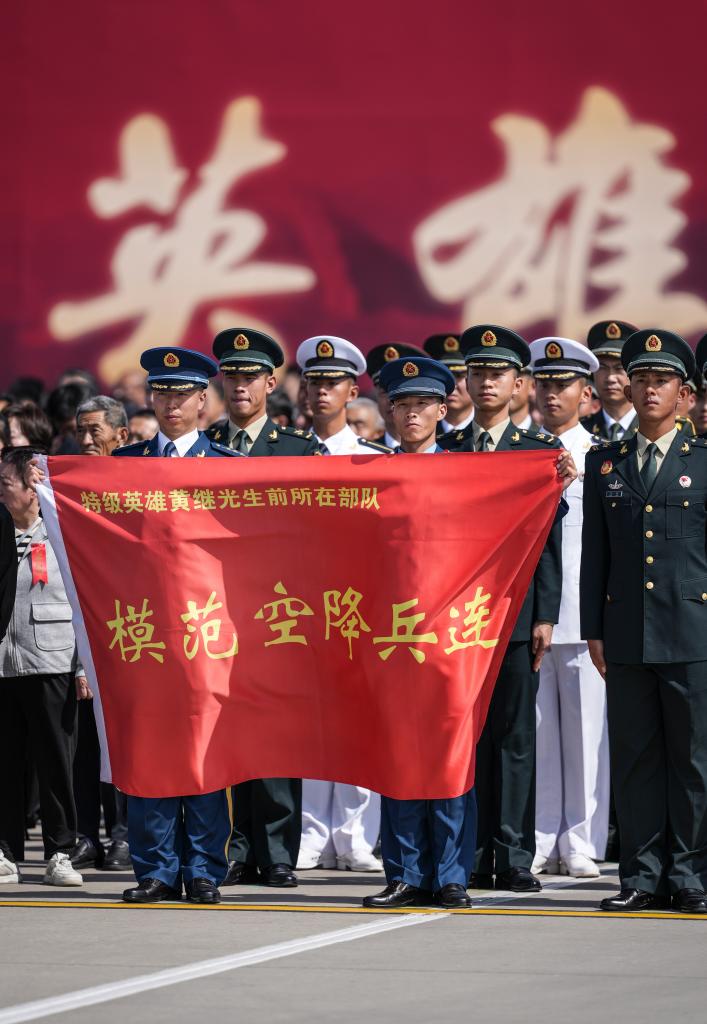 2025年9月12日,第十二批在韩中国人民志愿军烈士遗骸回国。这是空军空降兵某部“黄继光英雄连”官兵在沈阳桃仙国际机场举行的迎回仪式上。新华社记者潘昱龙摄