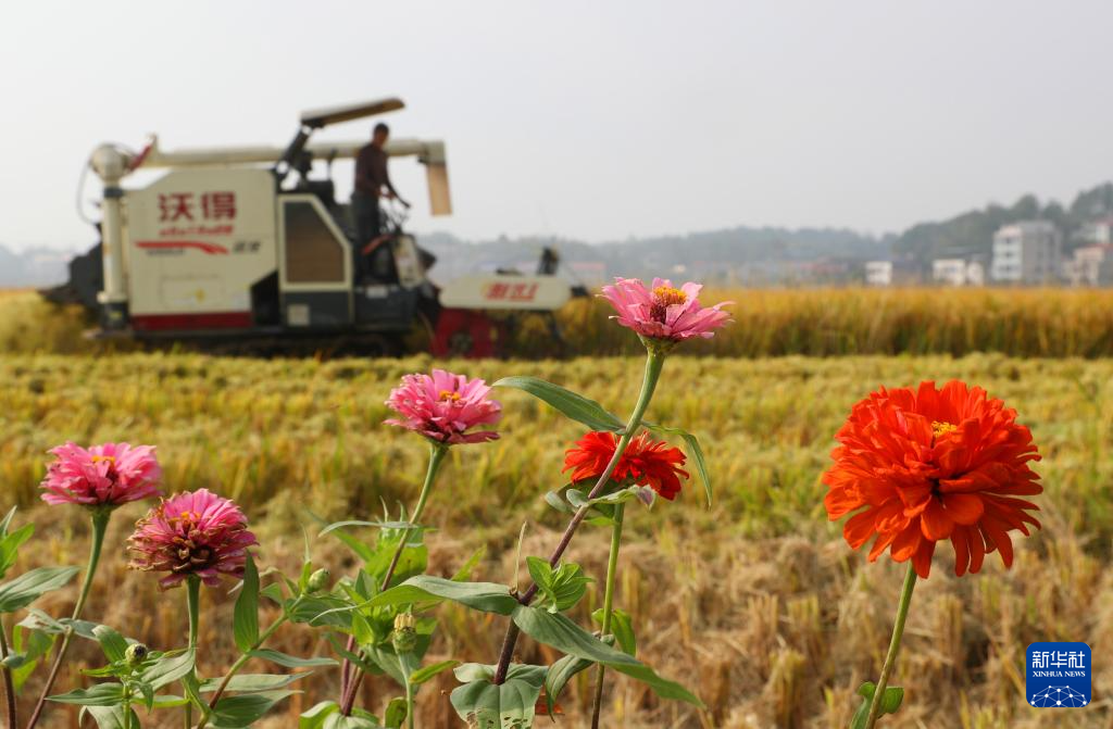 10月28日,湖南省衡阳市衡山县白果镇村民驾驶农机收割稻谷。新华社发(曹正平 摄)