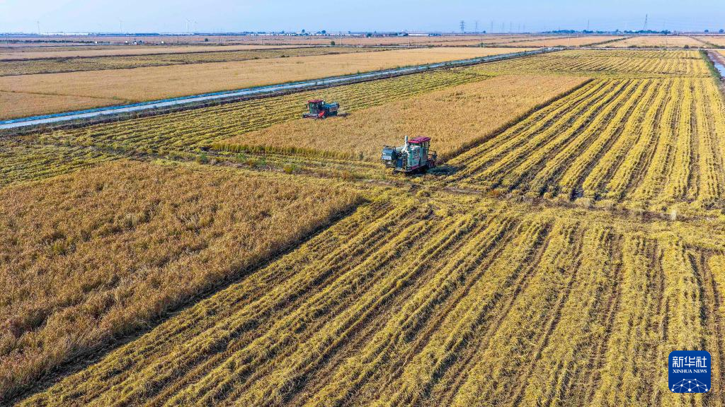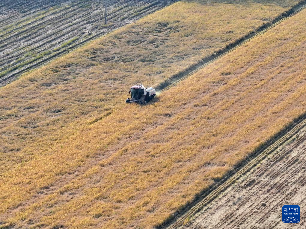10月27日,河北省唐山市海港经济开发区王滩镇农民驾驶农机在收获水稻(无人机照片)。新华社发(刘满仓 摄)