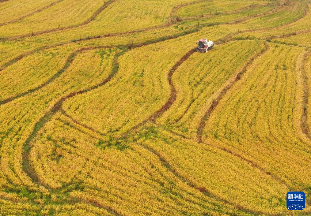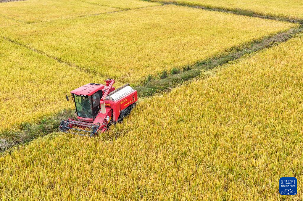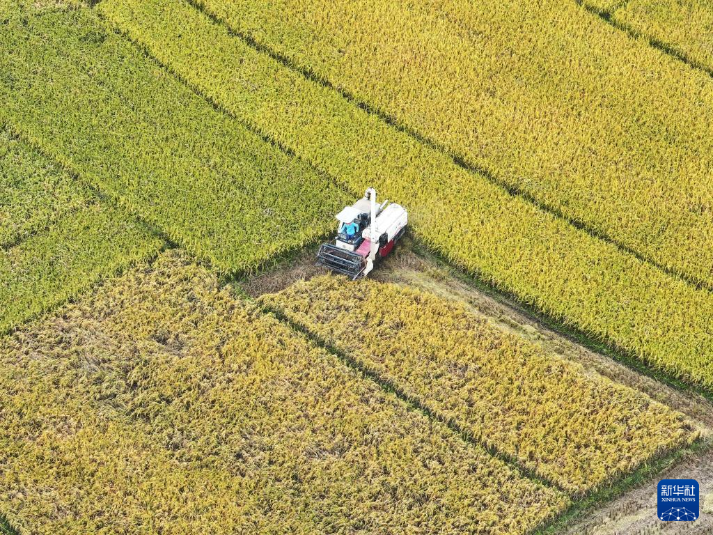 10月26日,在湖南省衡阳市衡东县杨林镇,当地村民驾驶农机收割再生稻(无人机照片)。新华社发(曹正平 摄)