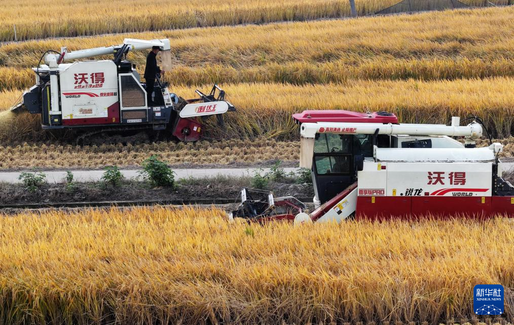 10月28日,湖南省永州市道县梅花镇棠下村,农机手驾驶机械收割晚稻(无人机照片)。新华社发(蒋克青 摄)