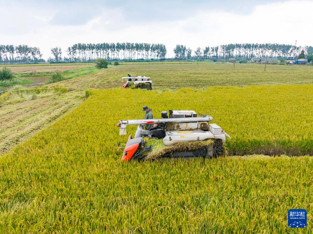 10月28日,在江苏省连云港市赣榆区沙河镇大站村,种植户驾驶收割机抢收水稻(无人机照片)。新华社发(司伟 摄)