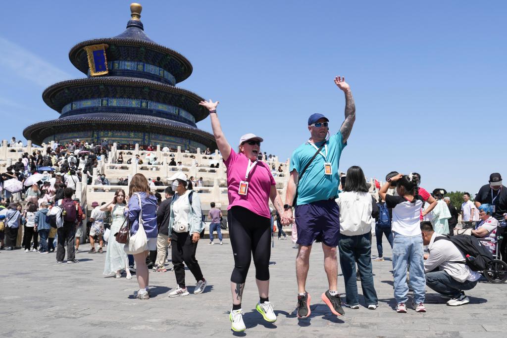 5月1日,来自澳大利亚的游客在北京天坛公园祈年殿前留影。