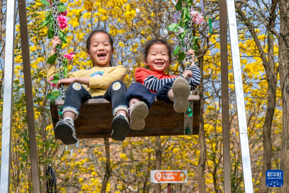 广西梧州市甜蜜家生态蜂业园连片的黄花风铃木盛放,小朋友在花下荡秋千(3月7日摄)。新华社发(何华文摄)