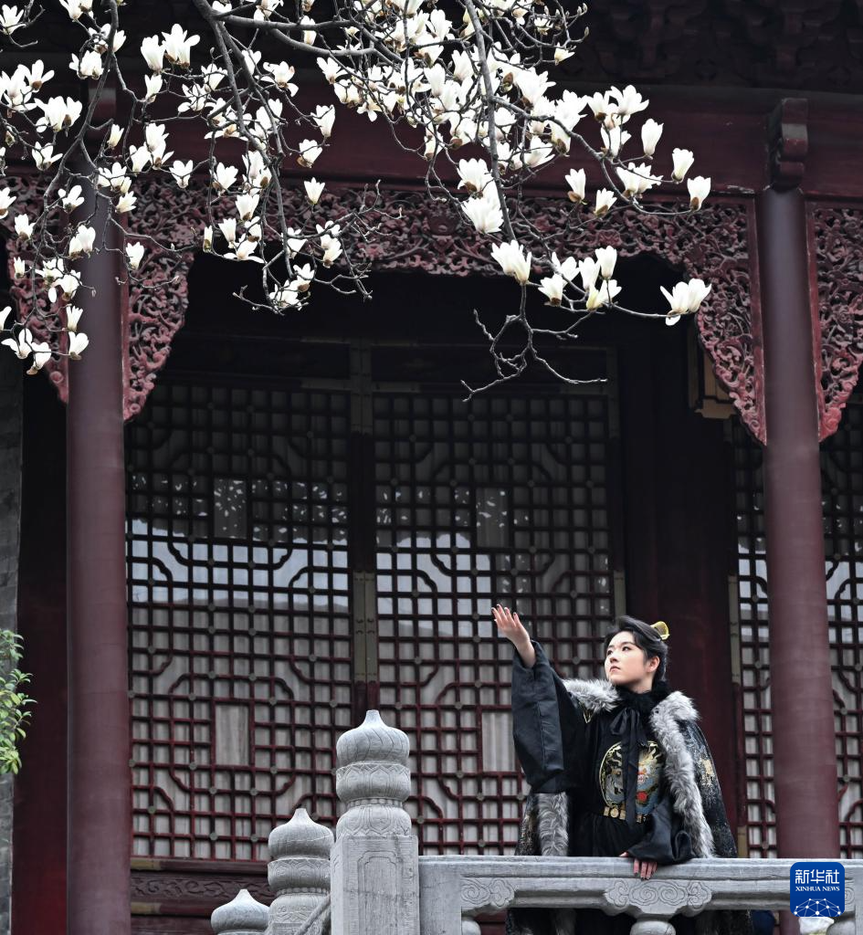 3月7日,身着古装的游客在江苏省南京市朝天宫景区与玉兰花合影。新华社发(孙忠南摄)