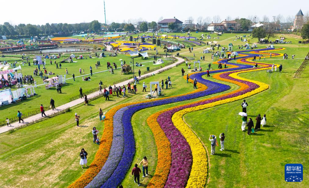 3月14日,游客在江苏省高邮市湖上花海景区赏花游玩(无人机照片)。新华社发(孟德龙摄)