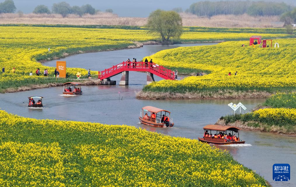 3月14日,游客在江苏省高邮市湖上花海景区乘船赏花(无人机照片)。新华社发(孟德龙摄)
