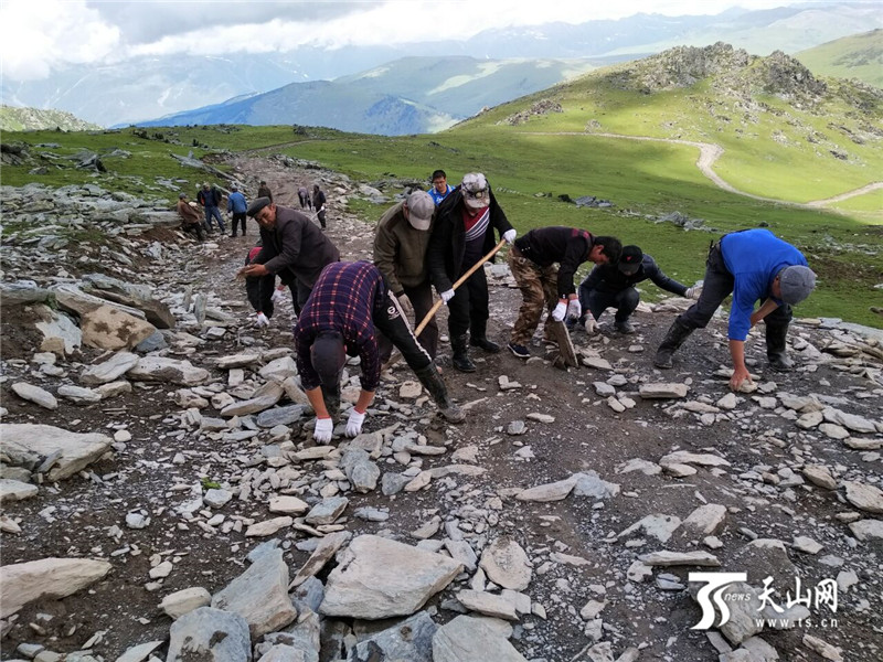 “牧道抢修队”齐心协力移走牧道上的大石。