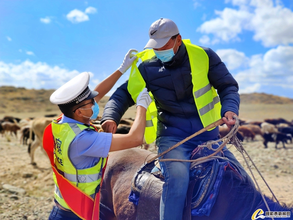 吉木乃县交警温馨提示,牧民转场还是要尽量走在路基下面,如果一定要在路上行走通过时,要穿上交警部门发放的反光背心保障自身安全,同时,给路上的车辆做好相应的警示。