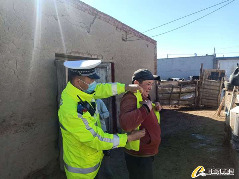 交警大队民警以阿勒泰市近年来因夜间光线暗、能见度低,驾驶人不能及时发现路上牲畜而引发交通事故为案列,劝导牧民群众为了自身的财产安全,夜间不要放牧,白天转场放牧时一定要穿戴反光衣,要管理好自家牲畜,不要让牲畜随意上路行走。