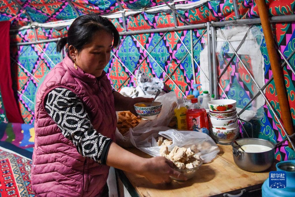 在新疆福海县齐干吉迭乡赛克露村一处冬牧场,牧民库力加孜拉·俄尔斯别克在家中准备午餐(11月24日摄)。新华社记者丁磊摄