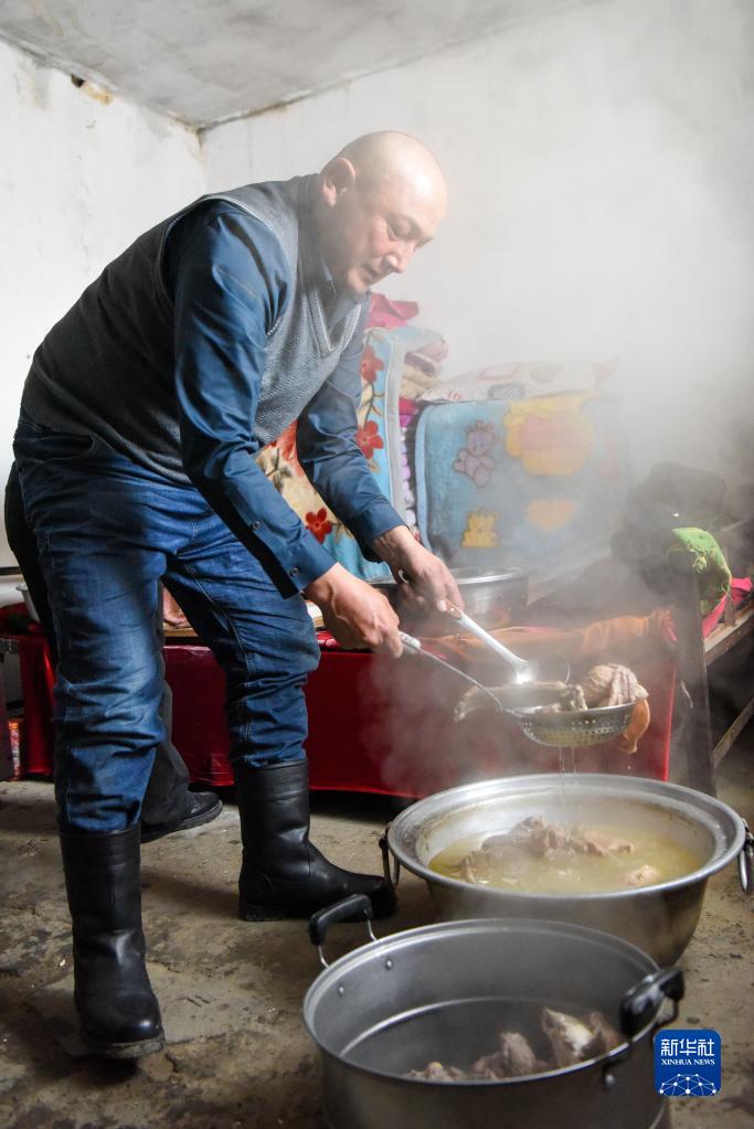 在新疆福海县齐干吉迭乡赛克露村一处冬牧场,牧民特留汗·乌海英白在准备午饭(11月24日摄)。新华社记者丁磊摄