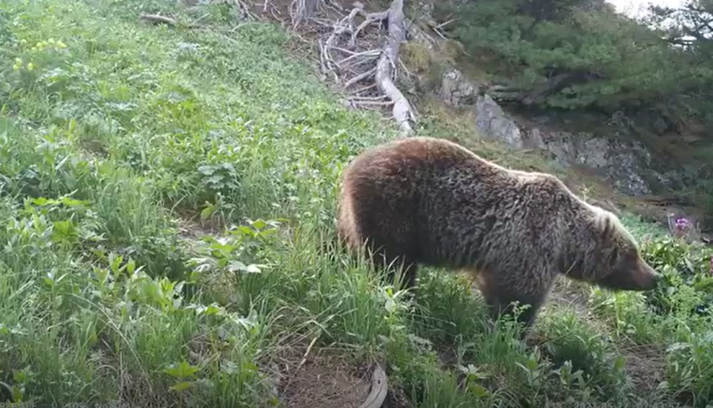 棕熊在草丛中悠闲地闻着花香。受访者提供