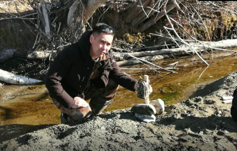 木哈买提汗在小溪边安装红外相机。受访者提供