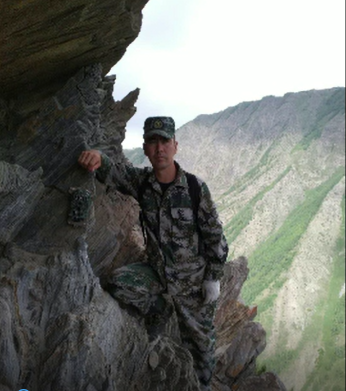 木哈买提汗·哈布都热黑曼在陡峭的山上安装完红外相机后的留影。受访者提供