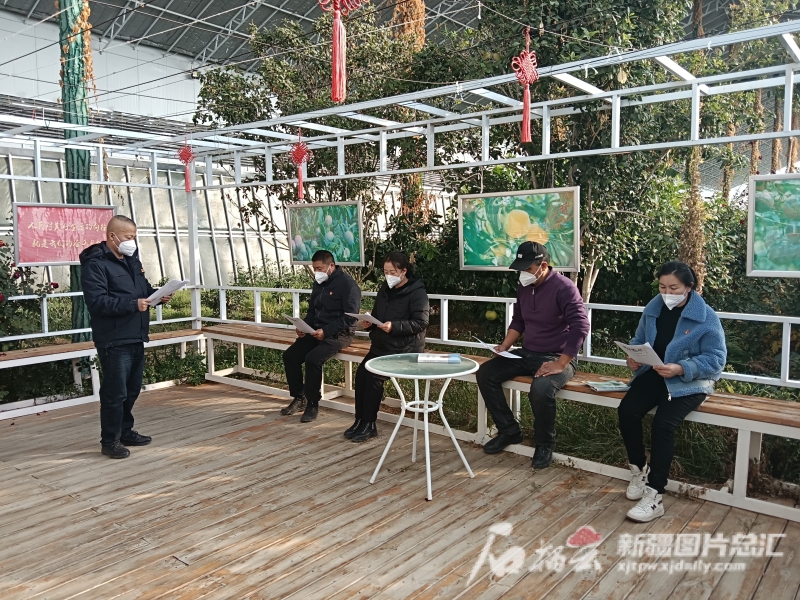 阿勒泰市残疾人联合会驻拉斯特乡拉斯特村第一书记、“访惠聚”工作队队长刘卫(左一)在拉斯特乡生态农业园区里宣讲党的二十大精神。马金保摄