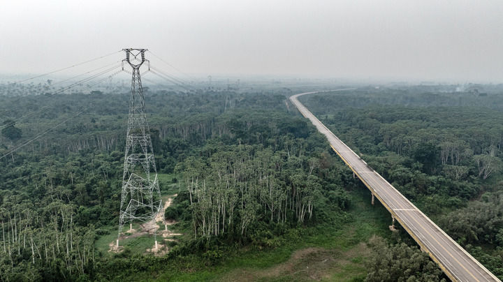 这张2024年9月13日拍摄的照片显示,在巴西朗多尼亚州,EDP输变电项目线路穿越热带雨林(无人机照片)。巴西EDP输变电项目是位于巴西北部的阿克里州和朗多尼亚州的绿地输变电工程,山东电建一公司承担了该项目的EPC总承包任务。项目全面完成后,将极大提升当地电网的输电能力,增强电力供应的可靠性和稳定性,对巴西北部地区的可持续发展和经济增长具有重要意义。新华社记者 王天聪 摄