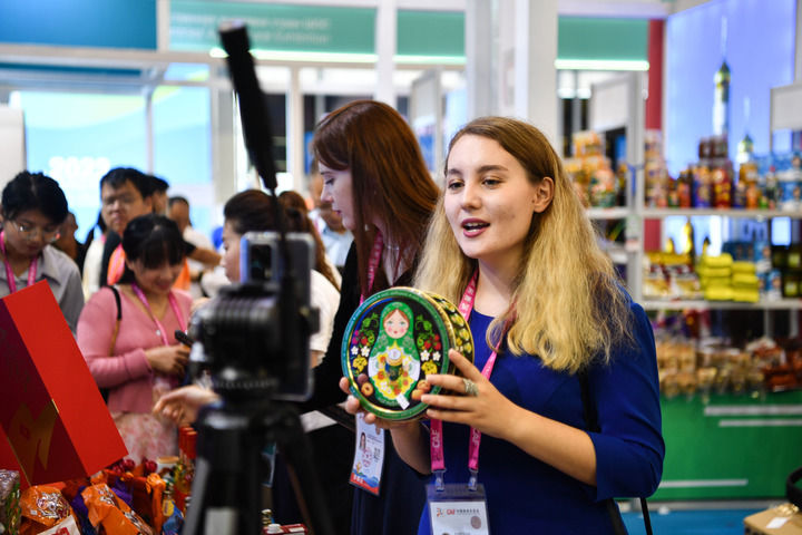 2023年9月19日,来自俄罗斯的参展商在中国陕西杨凌农高会展台进行直播。新华社记者 张博文 摄