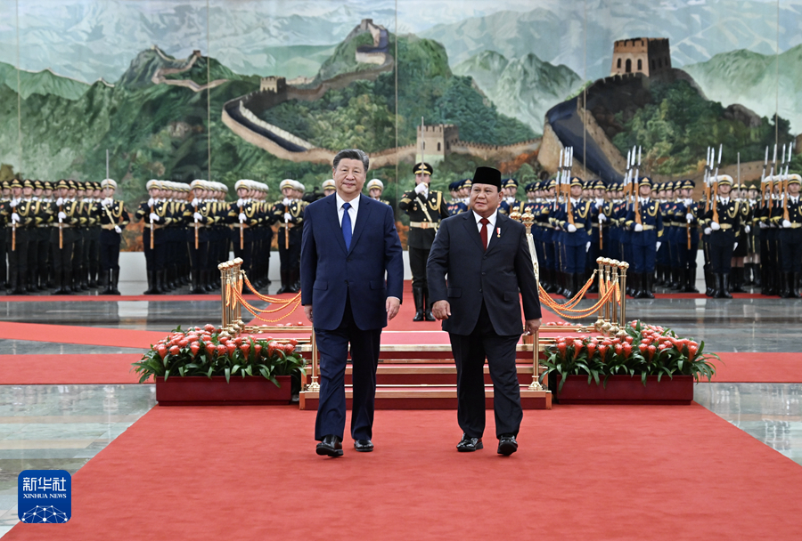 11月9日下午,国家主席习近平在北京人民大会堂同来华进行国事访问的印度尼西亚总统普拉博沃举行会谈。这是会谈前,习近平在人民大会堂北大厅为普拉博沃举行欢迎仪式。新华社记者 高洁 摄