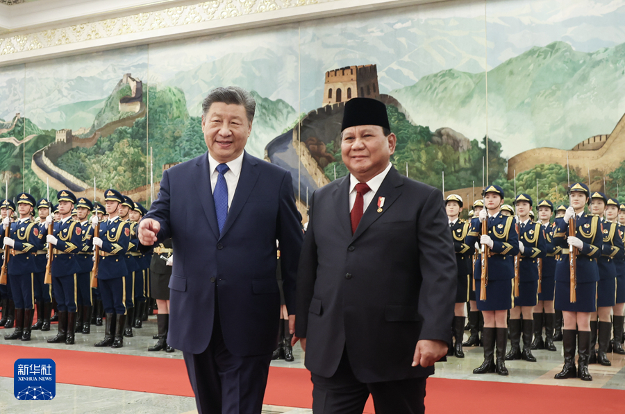 11月9日下午,国家主席习近平在北京人民大会堂同来华进行国事访问的印度尼西亚总统普拉博沃举行会谈。这是会谈前,习近平在人民大会堂北大厅为普拉博沃举行欢迎仪式。新华社记者 刘卫兵 摄
