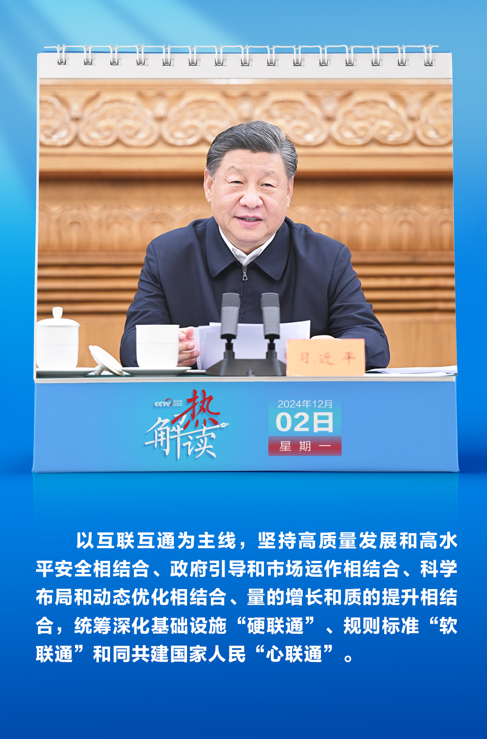 “统筹深化基础设施‘硬联通’、规则标准‘软联通’和同共建国家人民‘心联通’”,“完善‘硬联通’、‘软联通’、‘心联通’协调推进机制”。12月2日,习近平总书记在第四次“一带一路”建设工作座谈会上对深化三个“联通”再作部署。