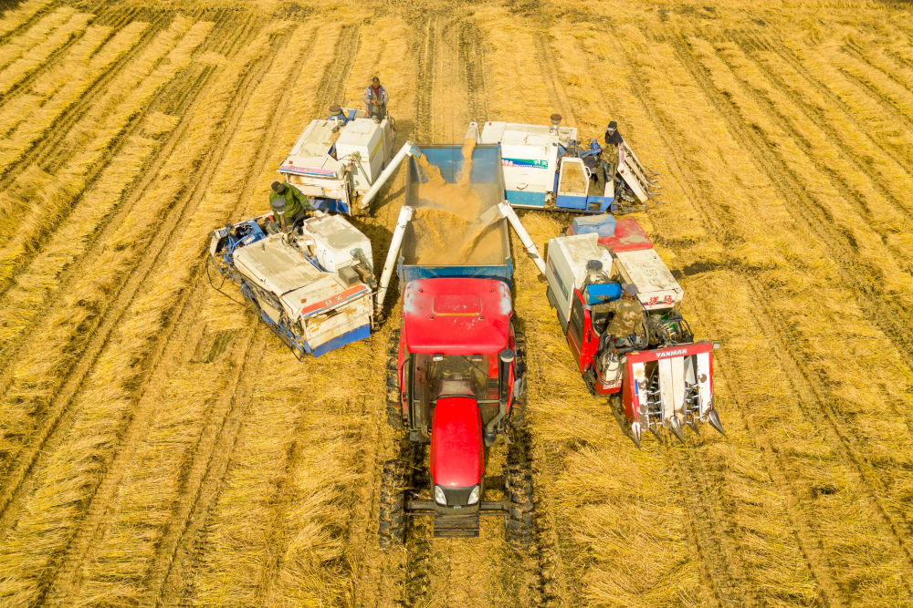 在黑龙江省绥化市北林区双河镇,村民驾驶收割机进行卸粮作业(2024年10月13日摄,无人机照片)。新华社记者 张涛 摄