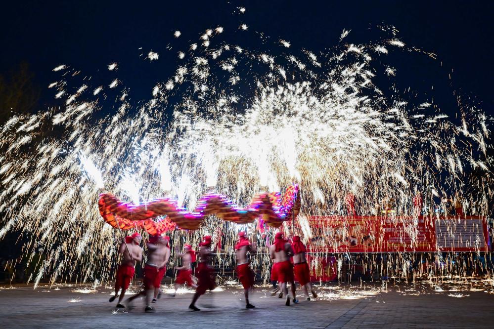 民间艺人在河南省洛阳市2024隋唐河洛文化庙会上表演打铁花(2024年2月14日摄)。新华社发(李卫超摄)