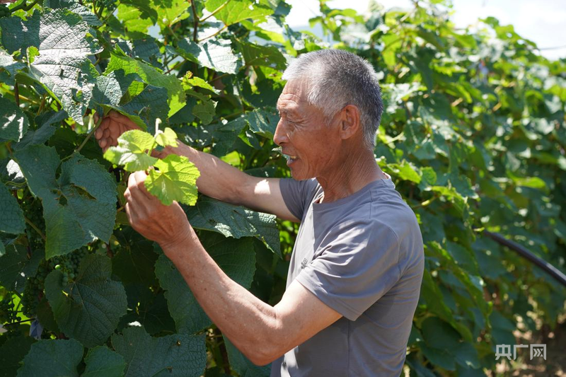 张国利为葡萄藤疏除过密枝条(央广网记者 李春雪 摄)