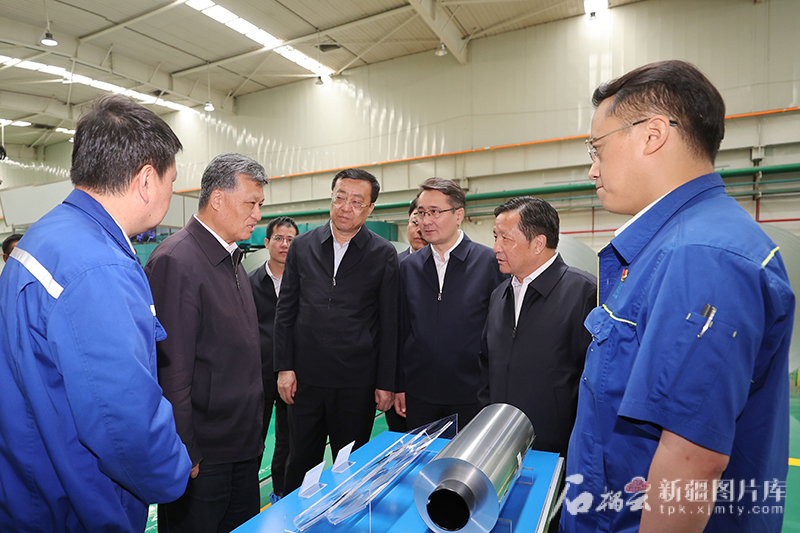 5月7日,自治区党委书记马兴瑞在位于甘泉堡经济技术开发区的新疆众和股份有限公司,察看铝箔产品生产和展示,与相关负责人深入交流。天山网-新疆日报记者 崔志坚摄