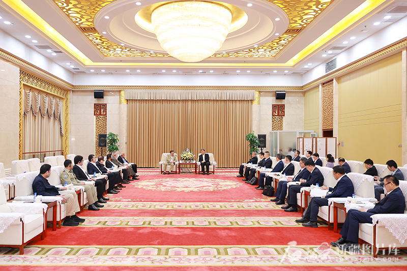 5月30日,自治区党委书记马兴瑞、自治区主席艾尔肯·吐尼亚孜在乌鲁木齐会见来新疆访问的巴基斯坦俾路支省省督谢赫一行。天山网-新疆日报记者 崔志坚摄