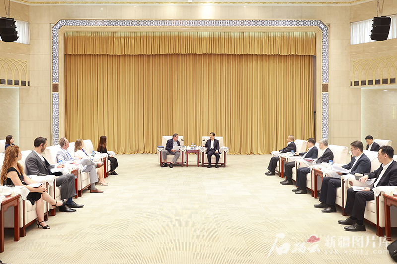 7月21日,自治区党委书记陈小江、自治区主席艾尔肯·吐尼亚孜在乌鲁木齐会见参加中美“飞虎队”友谊合作论坛的美中航空遗产基金会主席格林等外宾代表。天山网-新疆日报记者 崔志坚摄