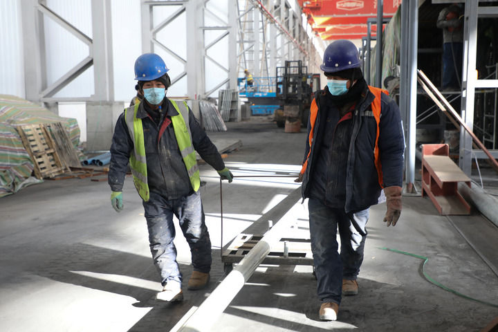 2022年12月12日,在位于兰州新区的兰州宏彬新能源发展有限公司,工人在搬运建材,抓紧施工。新华社记者 马希平 摄