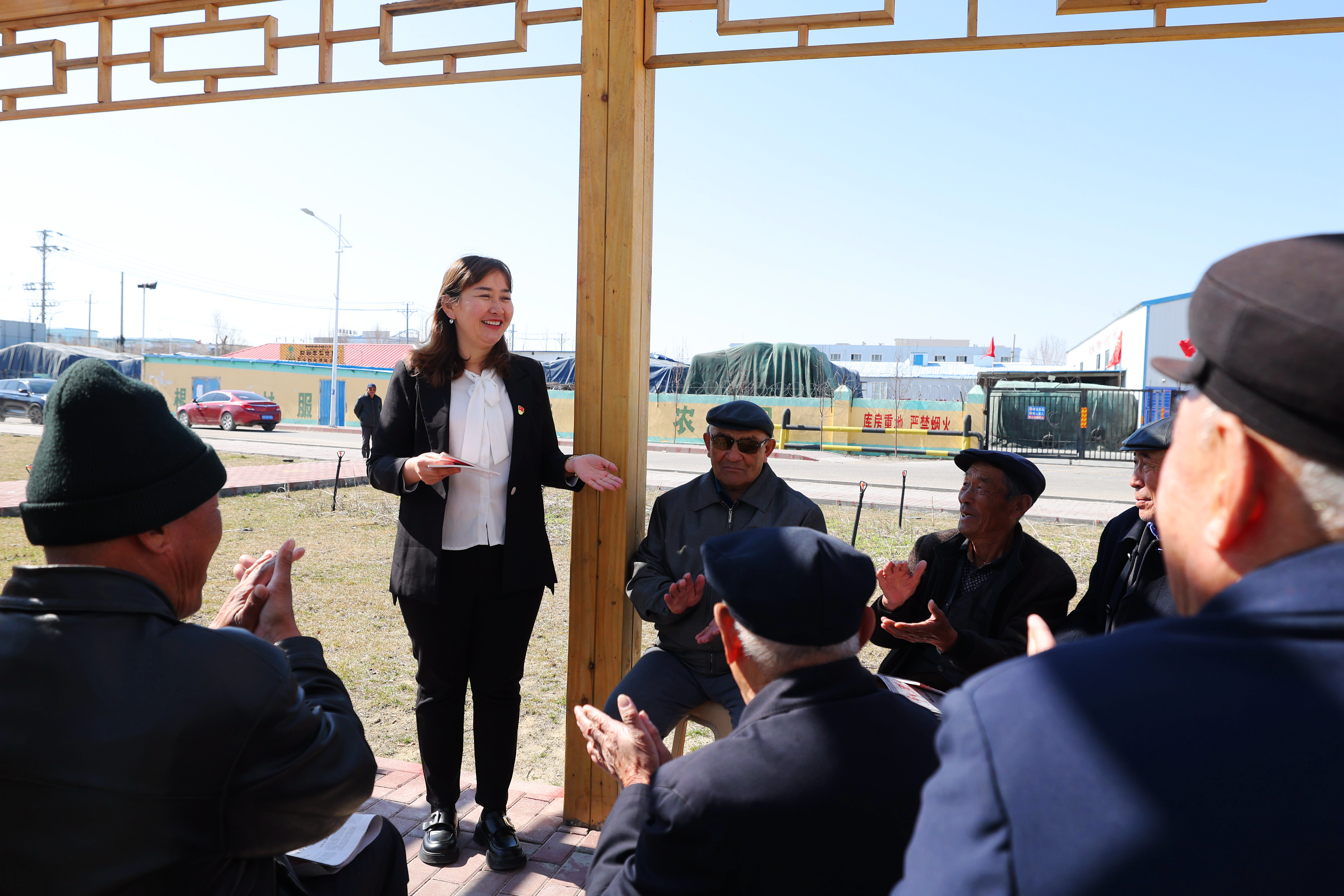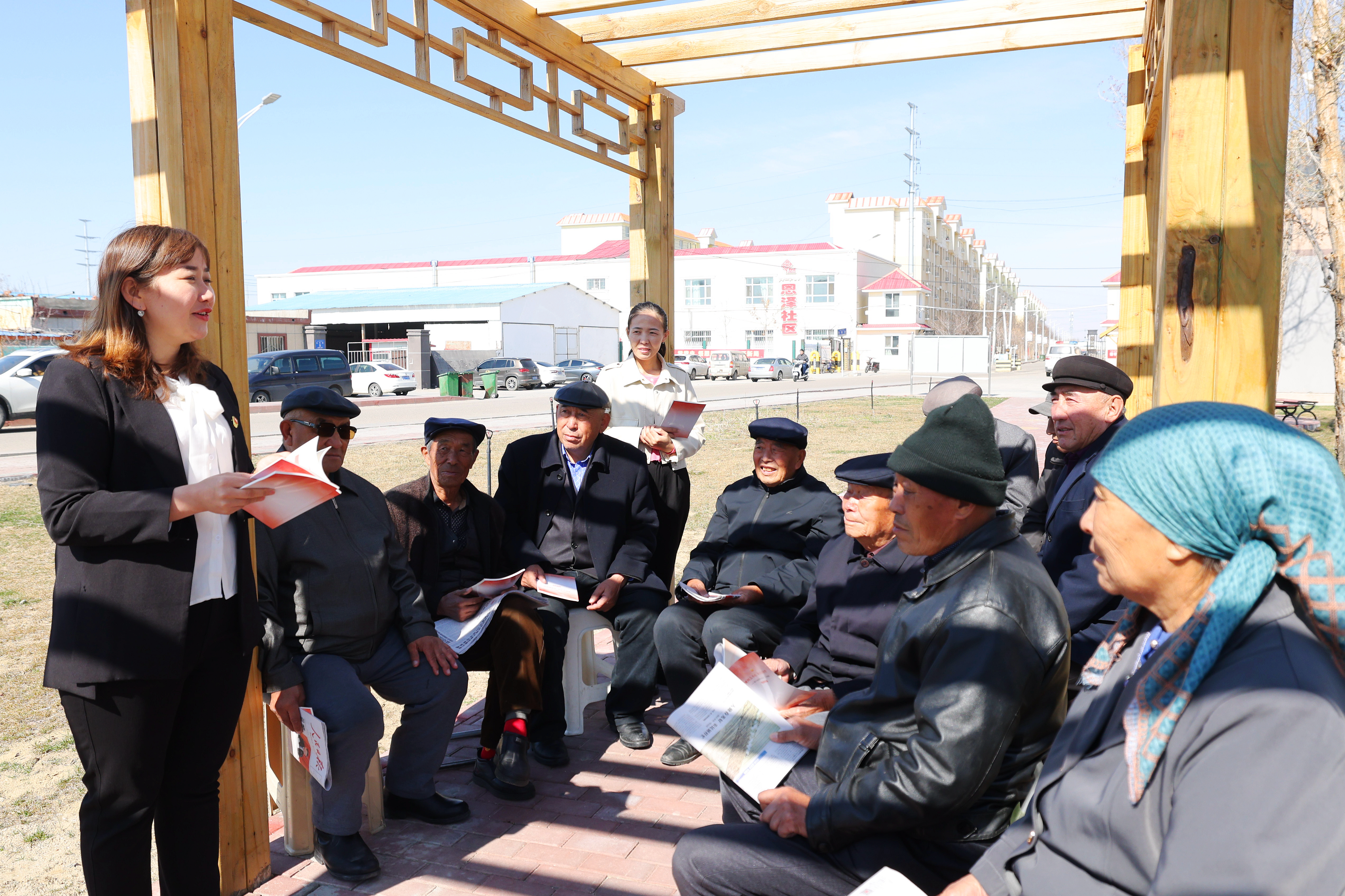 4月21日,阿勒泰市北屯镇恩泽社区党总支书记再吾列什·胡安别克(左一)为群众宣讲党的二十大精神。阿尔达克·拜斯汗 摄