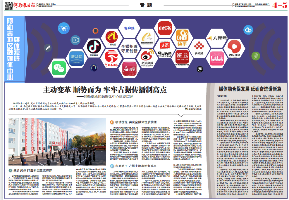2022年6月,阿勒泰地区融媒体中心建设被中宣部列为全国首批60家地市级试点单位之一。2022年8月,地委研究决定,将阿勒泰日报社、阿勒泰广播电视台、地区互联网新闻中心3家媒体机构进行合并,组建地区融媒体中心,同年10月1日正式挂牌,推动报纸、广播、电视等各平台的改版优化,将原阿勒泰日报社、阿勒泰广播电视台、地区互联网新闻中心三家媒体新媒体端账号进行全面融合,由原来31个平台帐号减少到24个,围绕“雪都嘟”客户端,“雪都融媒”抖音号、快手号和视频号,“阿勒泰发布”微博号、“阿勒泰零距离”微信公众号以及人民号、新华号、央视频号、石榴号等平台帐号,进一步聚合粉丝、汇聚流量,构建形成具有良好传播力、影响力的媒体传播矩阵。
