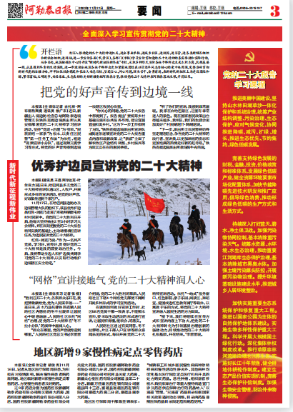 2022年,阿勒泰地区融媒体中心党委始终把坚守阵地作为做好意识形态工作的一项重要政治任务。坚持党管媒体不动摇,严肃宣传纪律、组织纪律、保密纪律,严格执行自治区党委宣传部、地委宣传部下达的各项宣传指令和宣传要求,做到守土有责、守土尽责、守土负责,紧紧围绕地委中心工作,唱响主旋律,打好主动仗。策划并落实党的二十大精神、习近平总书记视察新疆、全国两会等重要主题宣传,传播平台策划开设“奋进新征程•建功新时代”“全面深入学习贯彻党的二十大精神”“牢记殷殷嘱托•建设美好新疆”“疫情防控”等20余个专题专栏,截至目前,《阿勒泰日报》汉文版共出版221期1748个版面,哈萨克文版出版221期1760个版面,刊发原创新闻稿件2500余篇,开设新闻栏目39个;阿勒泰广播汉语新闻播发250期2949条,哈语新闻播发250期2949条,汉、哈萨克语节目共播出5608期;阿勒泰电视汉语新闻播发250期2436条,哈语新闻播发250期2436条。