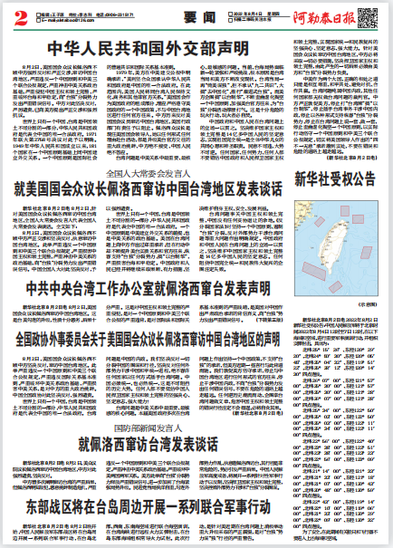坚决守好意识形态领域阵地,扎实做好对外斗争舆论引导工作,《阿勒泰日报》及时转发新华社刊发的《中华人民共和国外交部声明》《两岸统一的历史大势不可阻挡》《国外交部宣布针对佩洛西窜台反制措施》等稿件,深刻揭露西方不良政客的丑恶嘴脸。