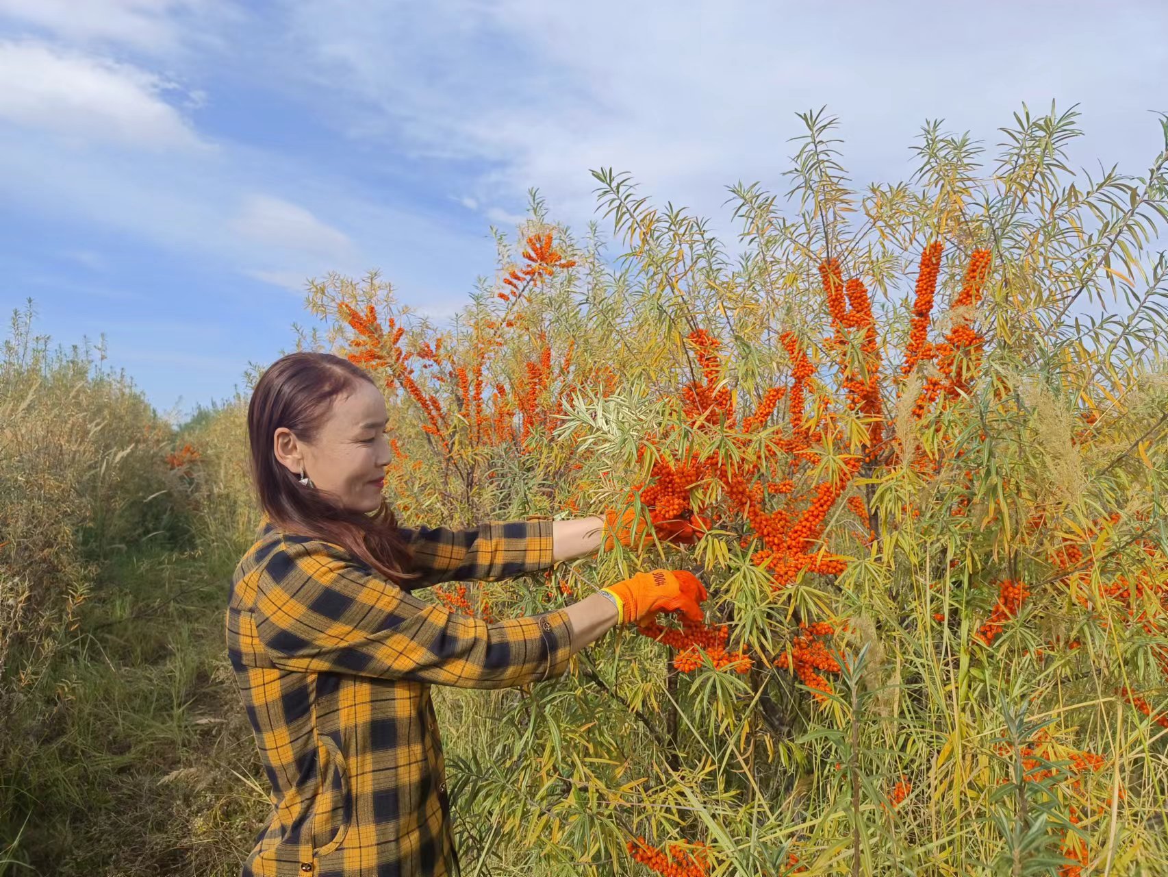青河县阿格达拉国家级农业产业示范园采摘“沙棘”。