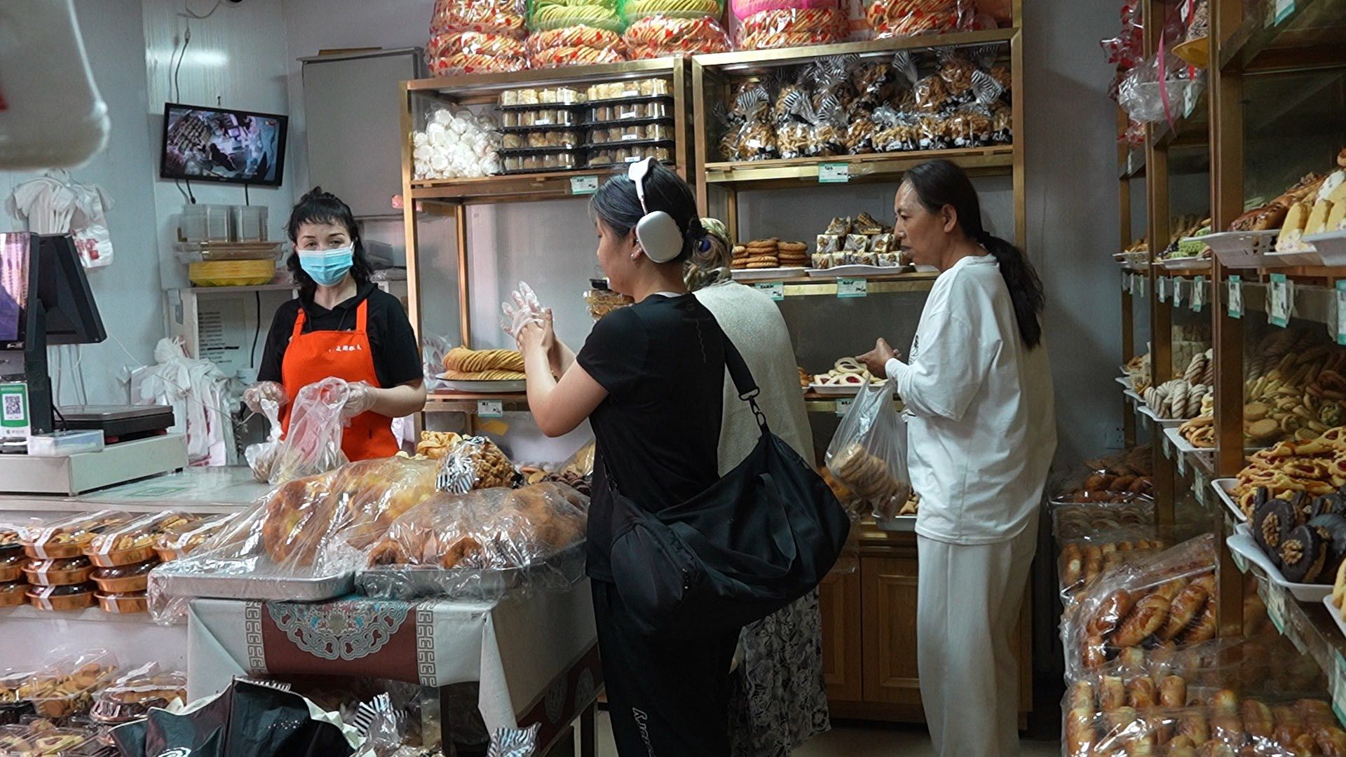在阿勒泰市某糕点房,金黄色的馓子、精致的各类糕点整齐摆放在货架上,吸引了不少顾客选购。