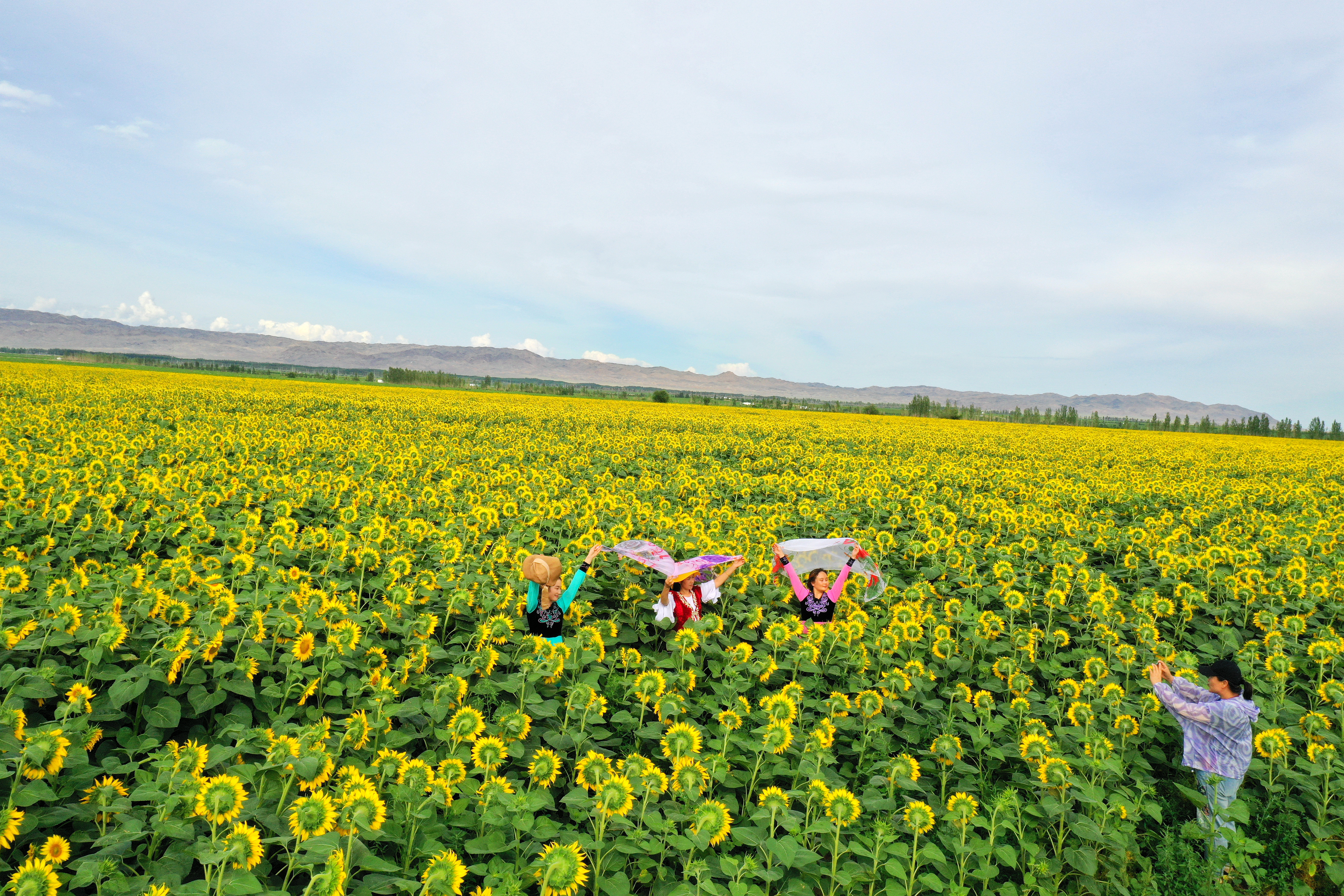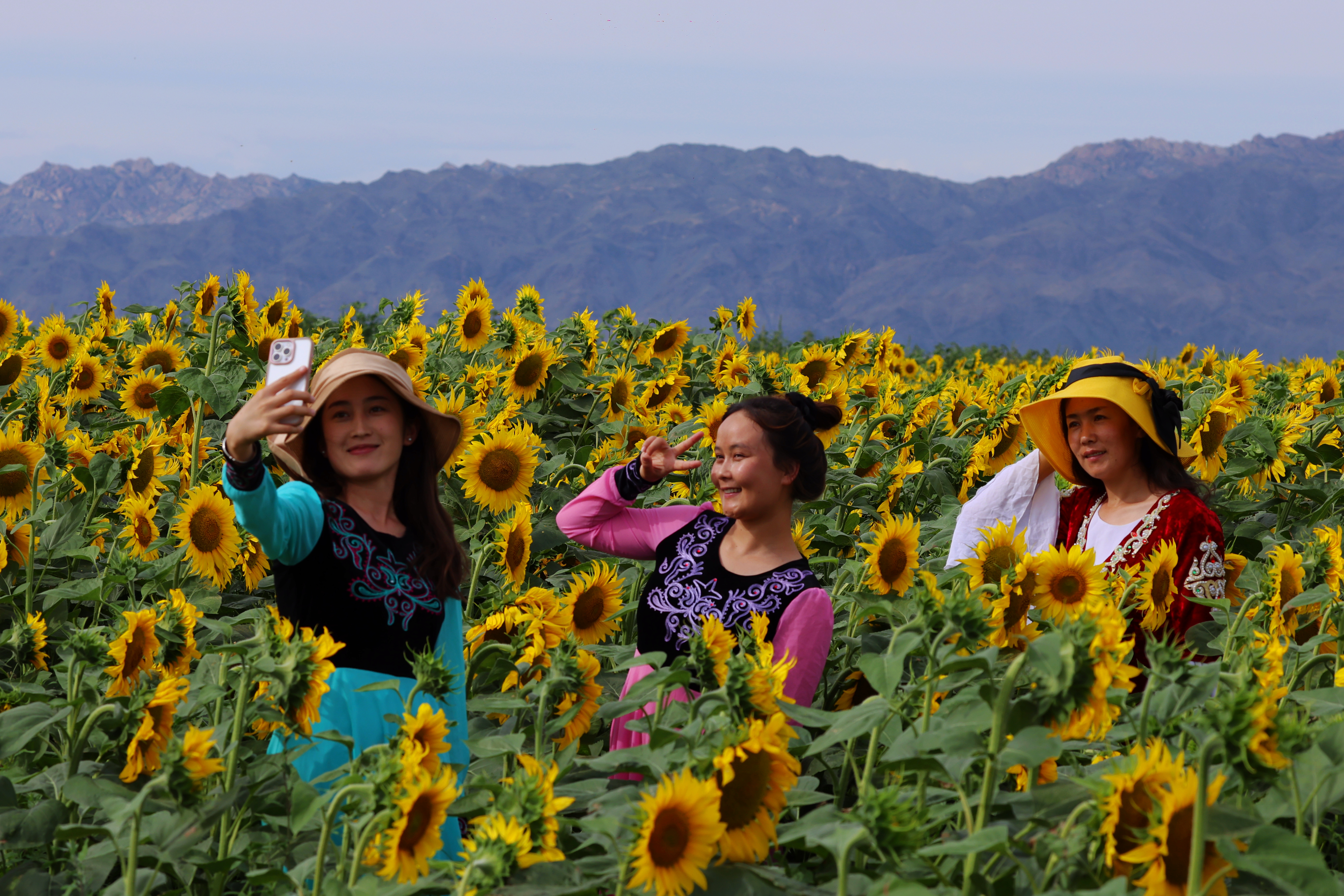 7月18日,游客在阿勒泰市阿拉哈克镇油葵种植基地拍照、游玩。