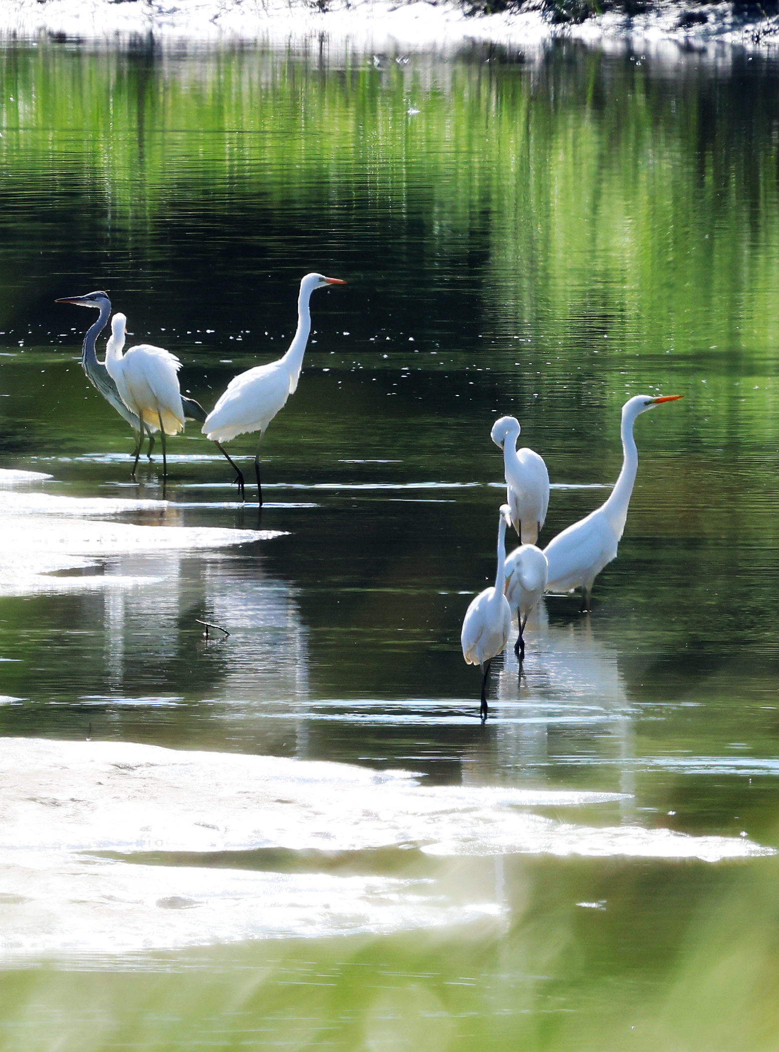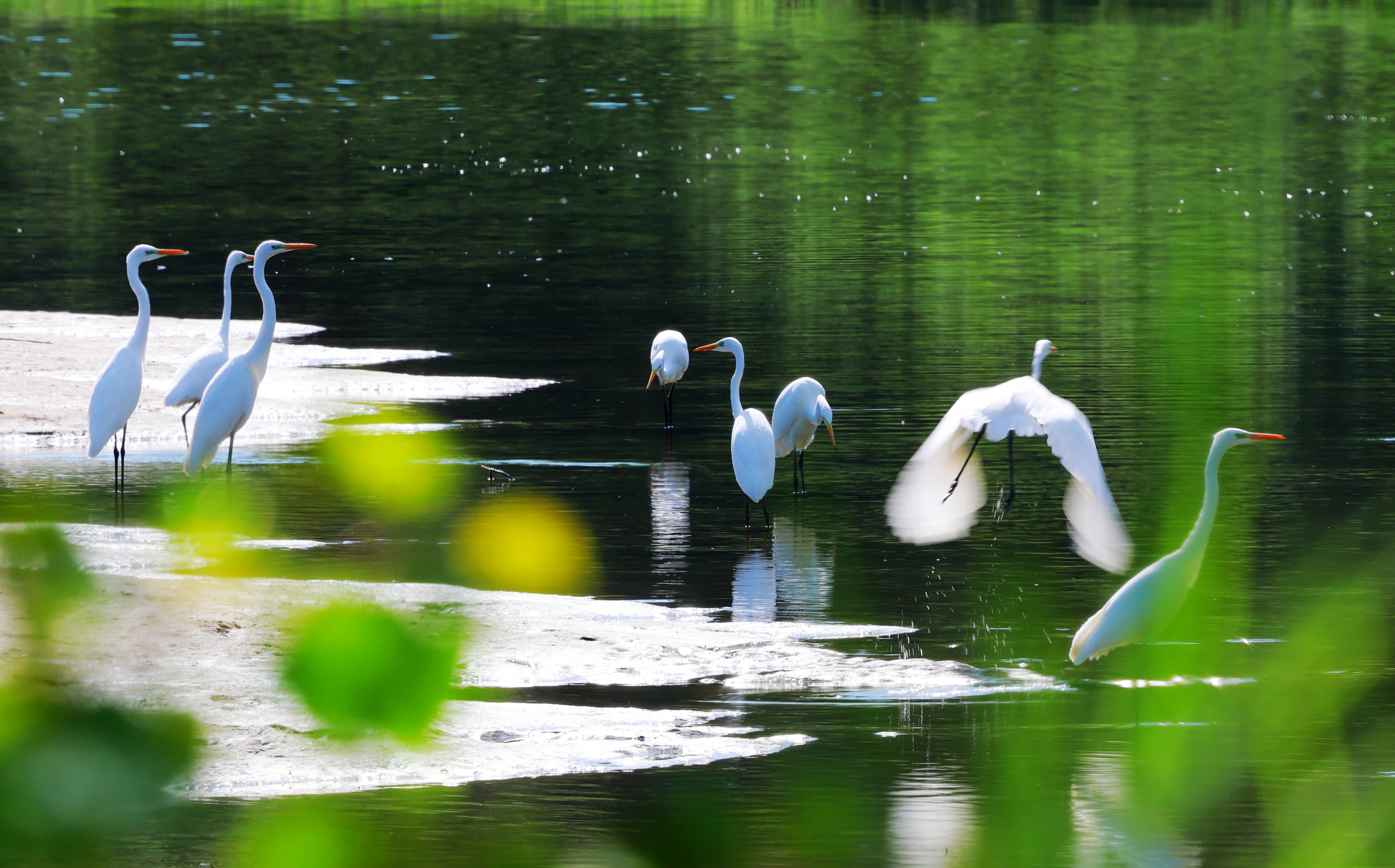 7月18日,成群的白鹭在阿勒泰科克苏湿地国家级自然保护区栖息、觅食。