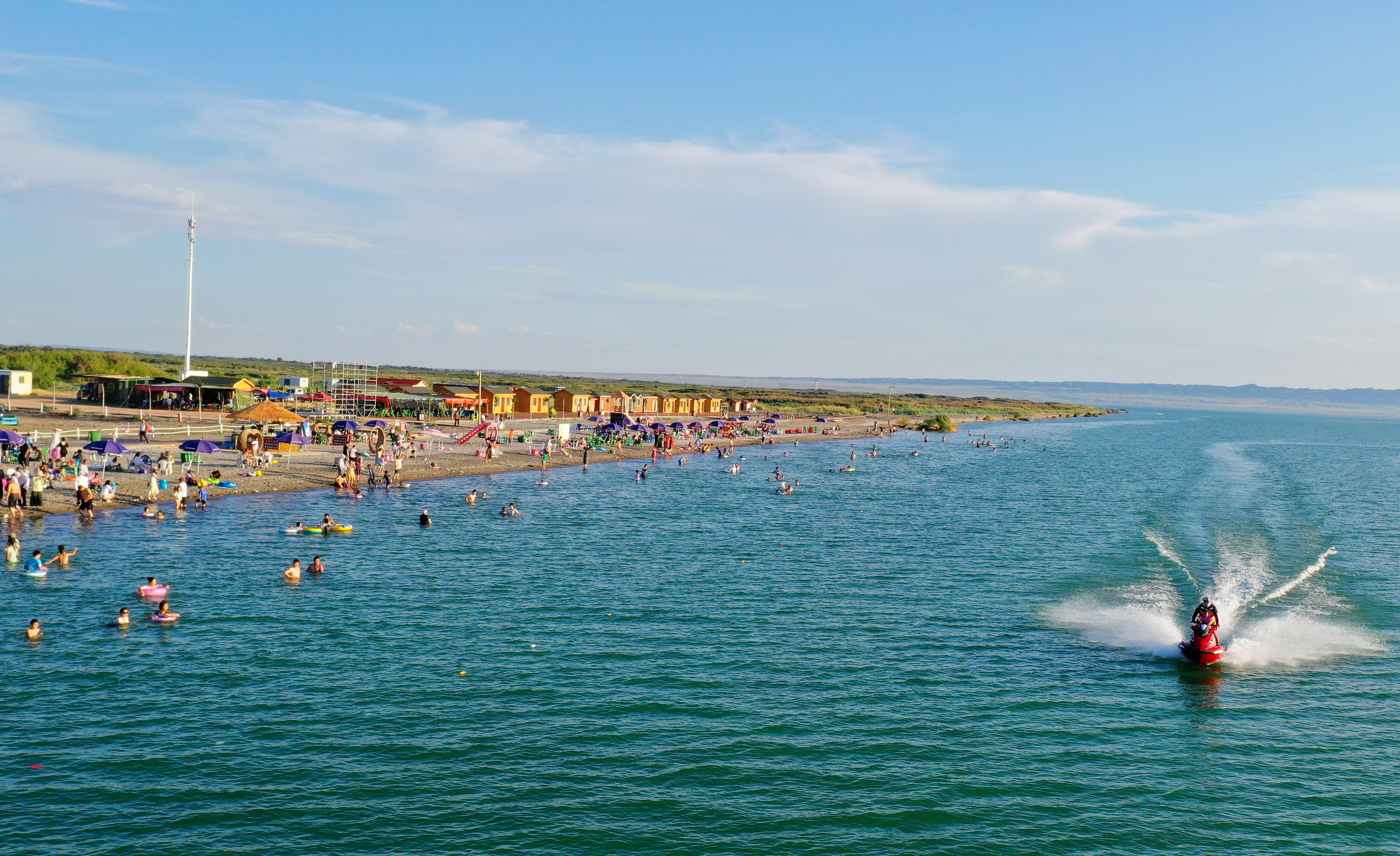 阿勒泰新闻网-阿勒泰地区融媒体中心(记者 阿尔达克·拜斯汗) 7月26日,游客在福海县乌伦古湖金沙滩景区戏水游玩。随着旅游旺季到来,福海县乌伦古湖景区吸引了众多游客前来体验水上乐趣。