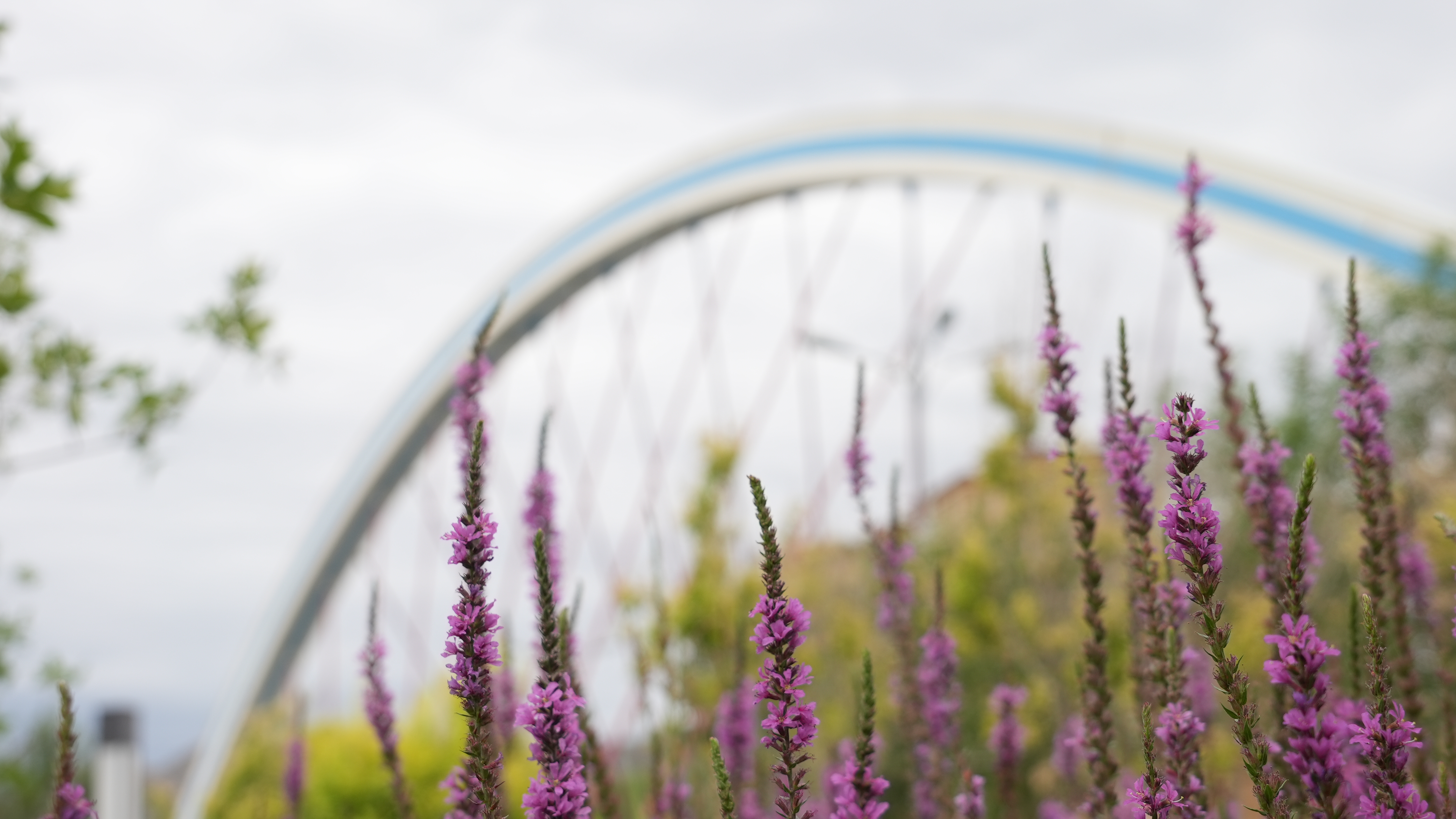 炎炎夏日,阿勒泰市望湖桥边的鼠尾草花盛开。