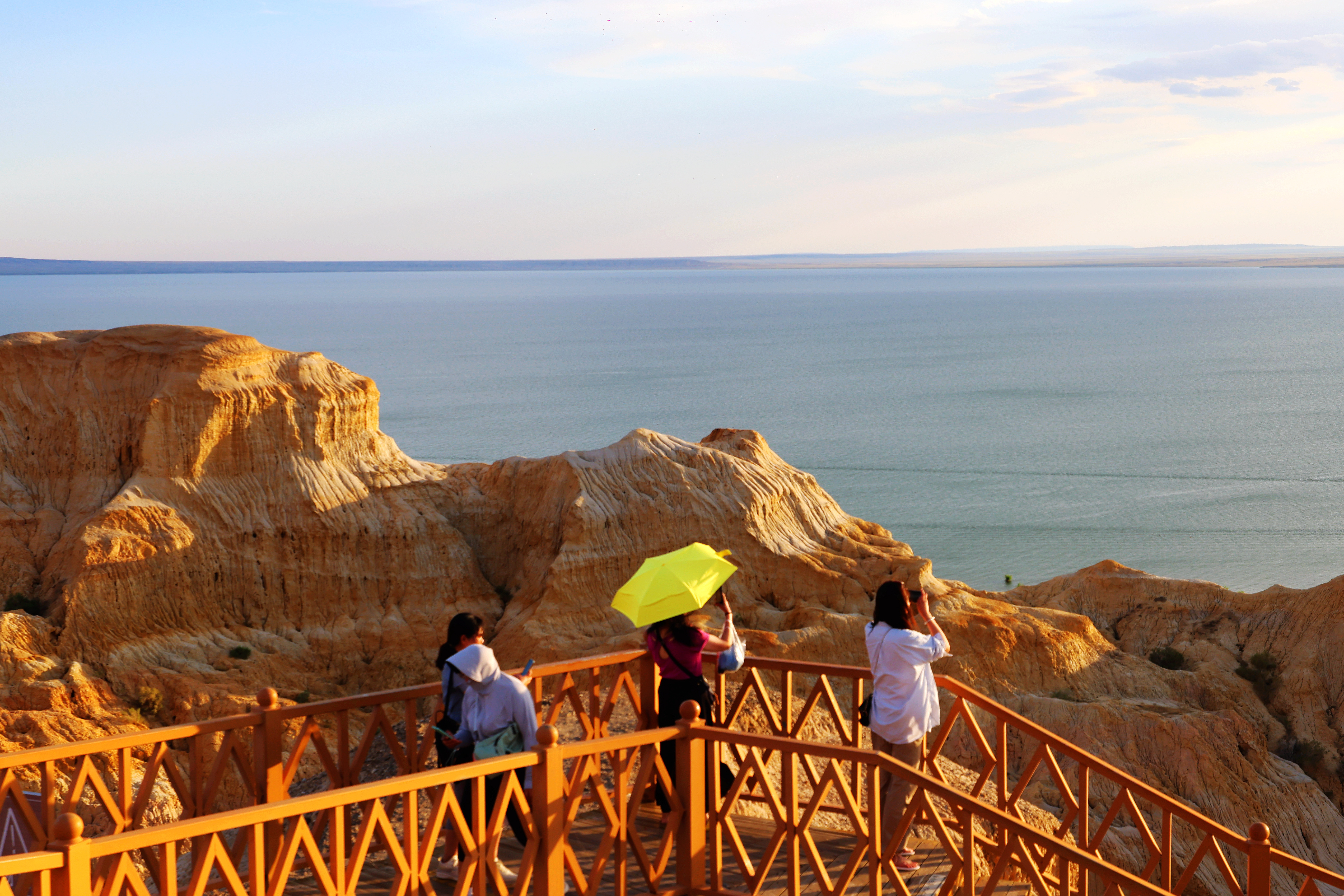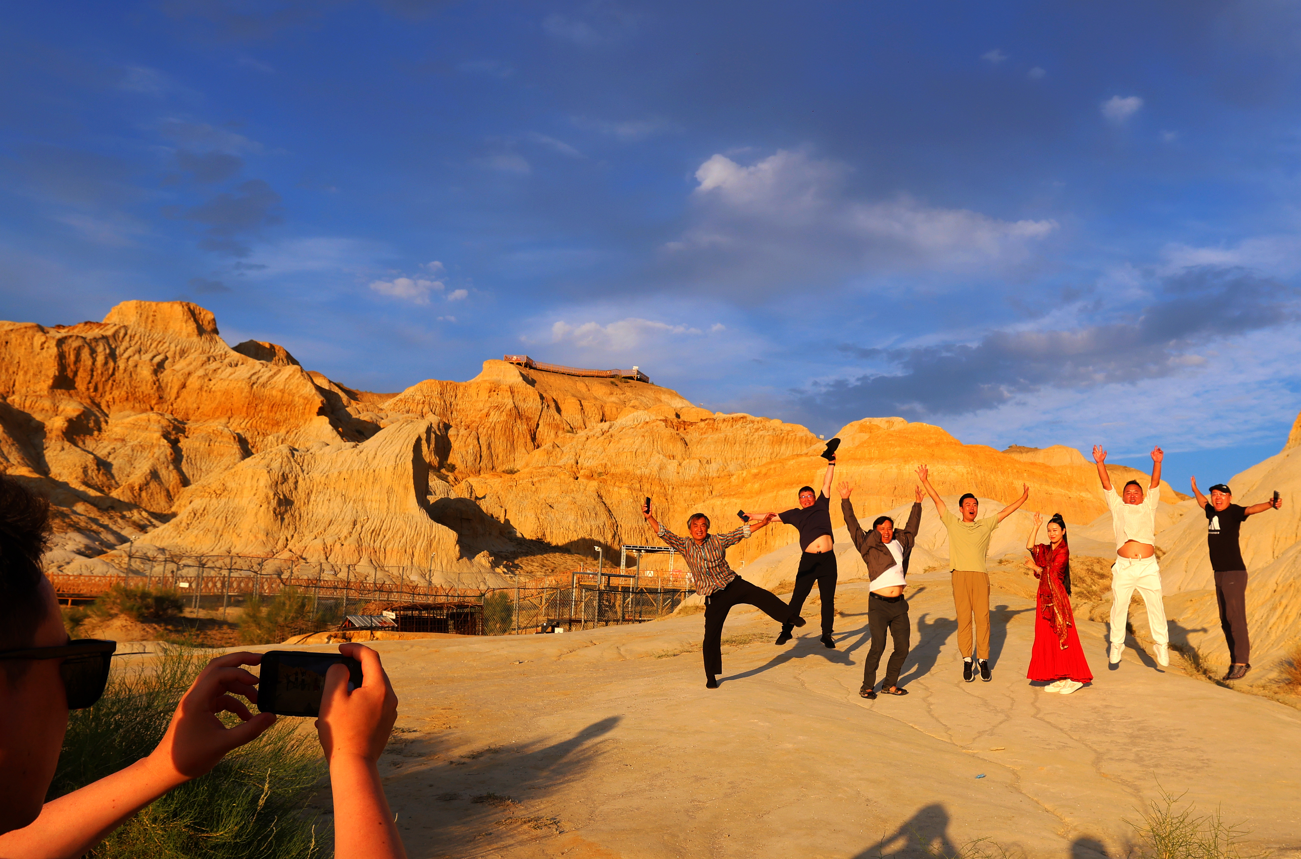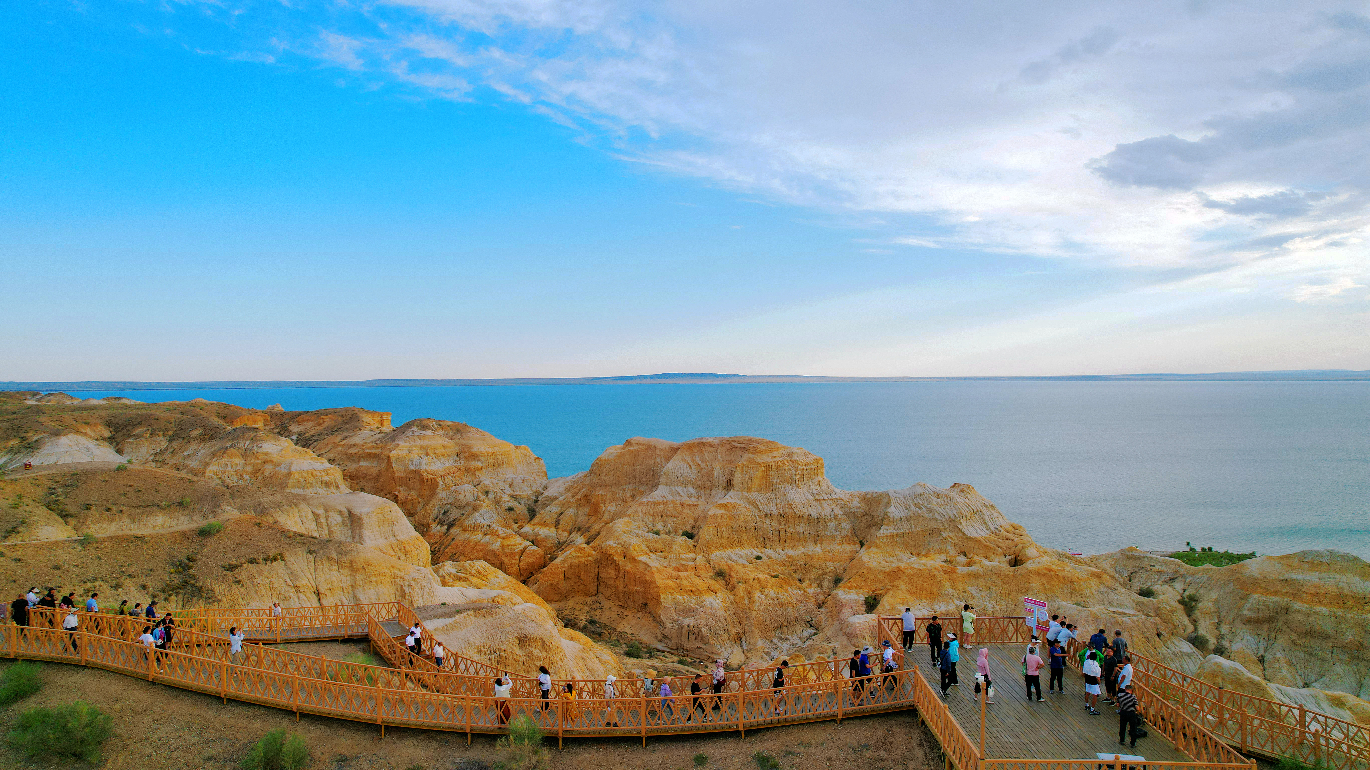 阿勒泰新闻网-阿勒泰地区融媒体中心(记者 阿尔达克·拜斯汗)8月9日,游客在福海县海上魔鬼城景区游览观光。游客们被大自然的鬼斧神工之作深深吸引,漫步其中,仿佛置身于五彩斑斓的彩色梦境。