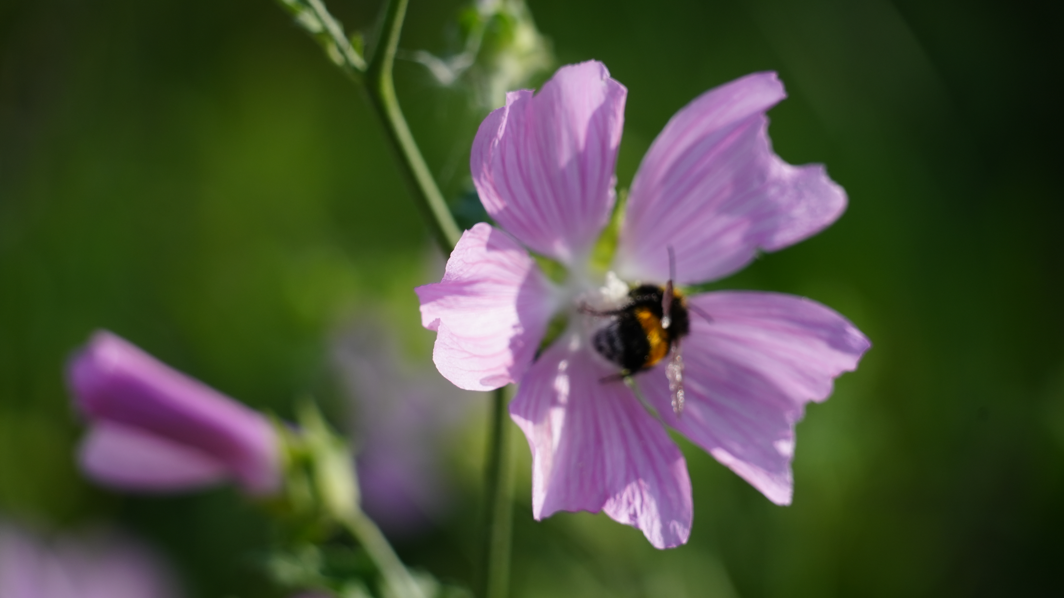 山花开,蜂自来。初秋,在阿勒泰市阿尔泰山中段南麓的一处山坡上一簇簇麝香锦葵正在自由绽放,花香醉人。