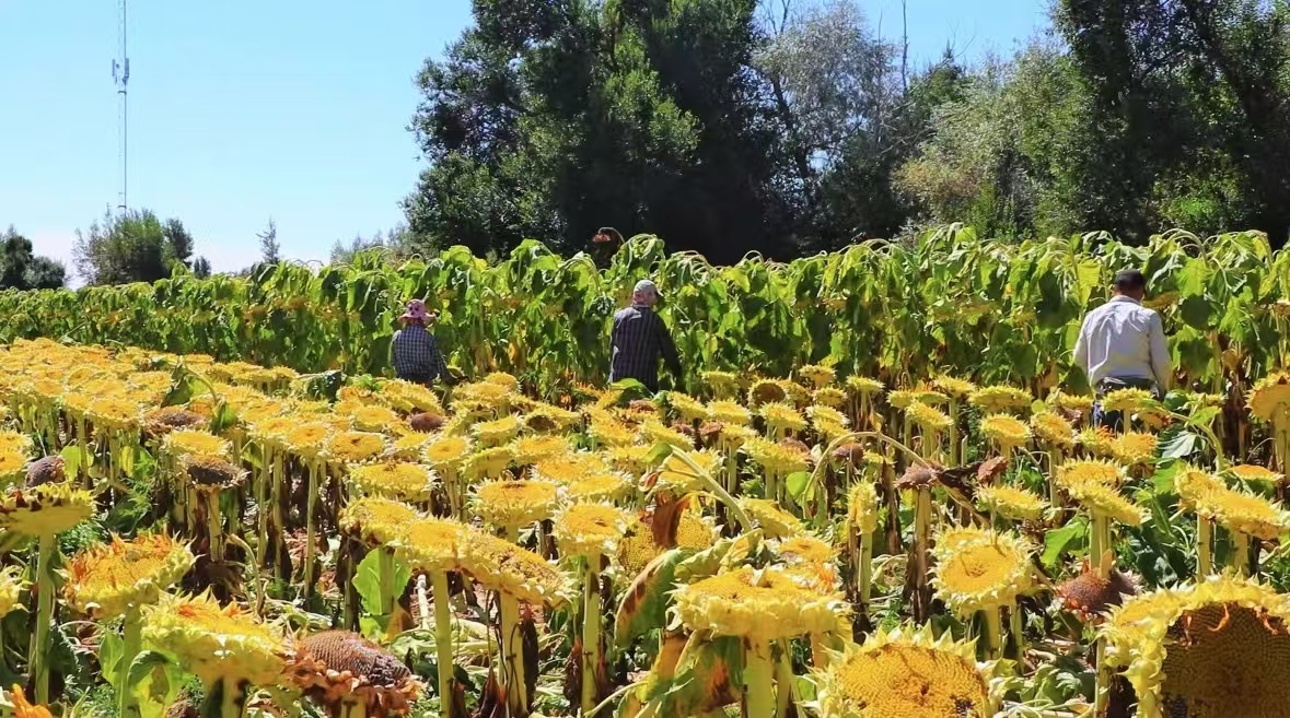 阿勒泰新闻网-阿勒泰地区融媒体中心(实习记者 王景鸿 通讯员 沙妍粼)9月1日,记者在哈巴河县库勒拜镇看到,5万余亩食葵陆续进入采收期,一株株葵花好似“金盘子”,被颗粒饱满的瓜子压弯了腰。农民挥动着手中的镰刀,熟练地割下葵花盘并插在茎秆上,等待风干后脱粒收获。