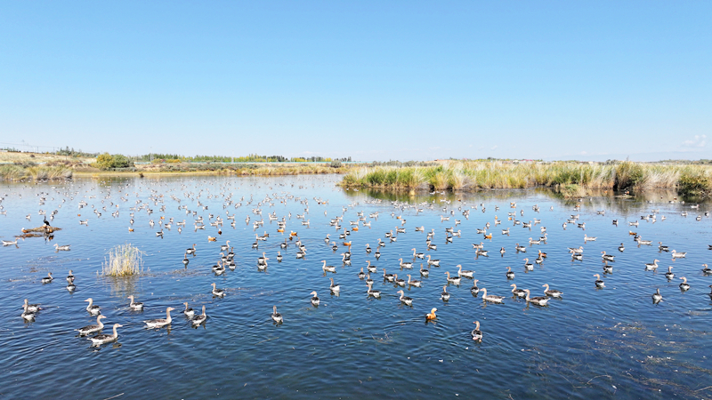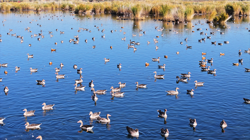 每年10月,布尔津湿地都会迎来成群结队的候鸟,或翱翔于湿地上空,或漫游水面,或于草木中栖息,为秋季的湿地公园增添了一道亮丽的风景。