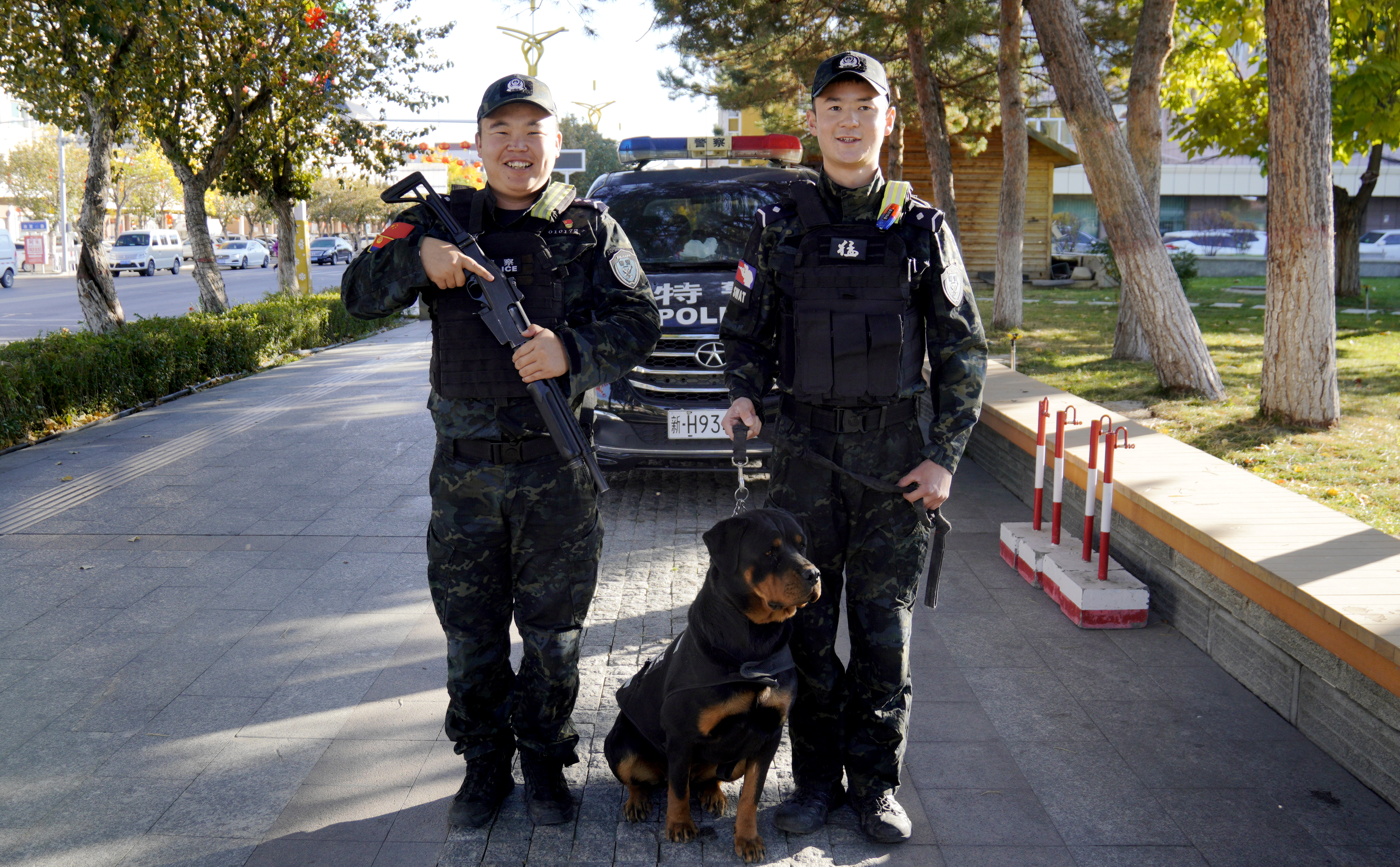 阿勒泰市公安局特巡警大队队员胡阿提别克·肯杰汗、哈比提·巴依木拉提:“祝福祖国,国泰民安,强国有我、请党放心!”实习记者 彭林海摄