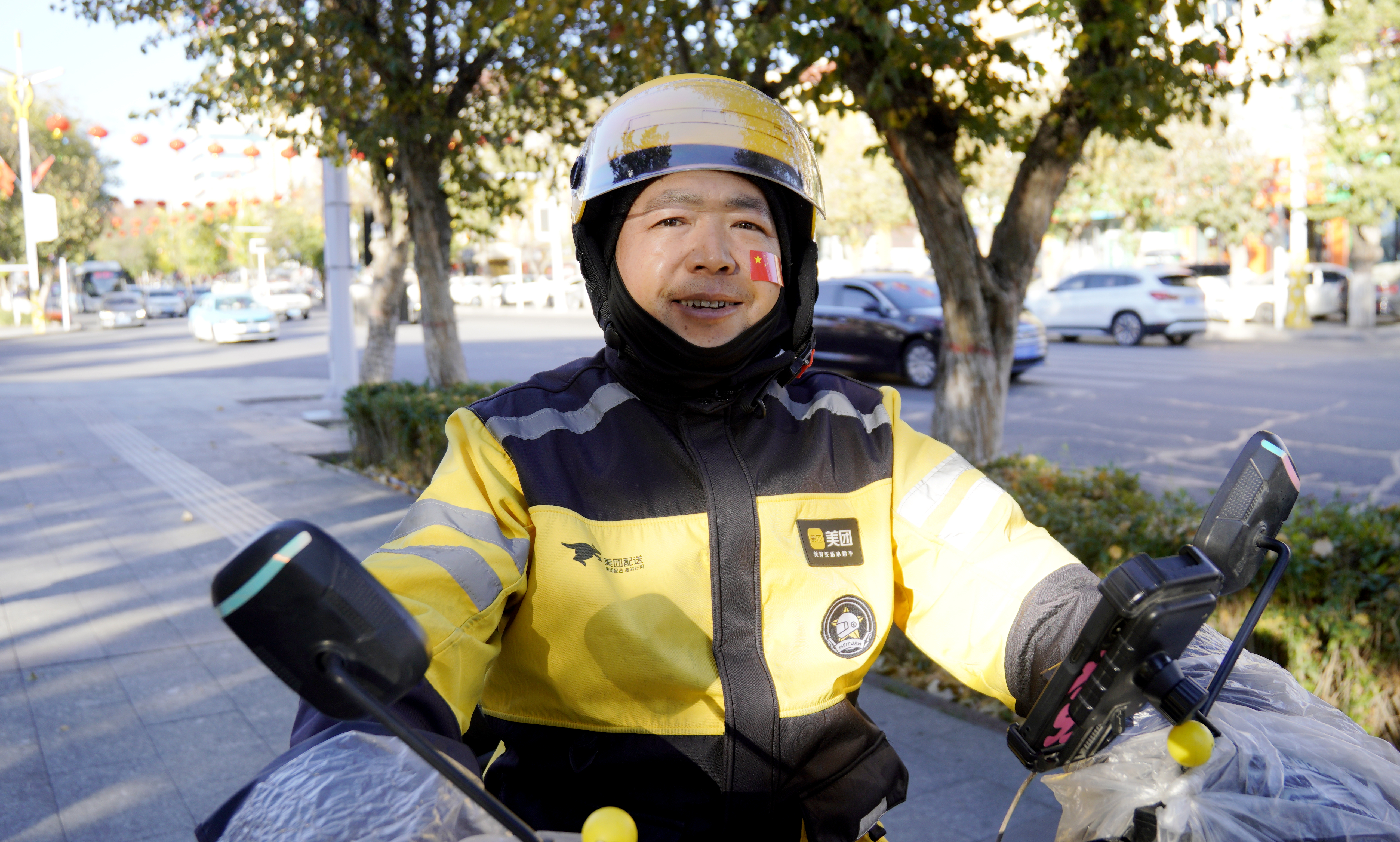 阿勒泰市美团外卖员何兆军:“祝福祖国永远强大,生日快乐!”实习记者 彭林海摄